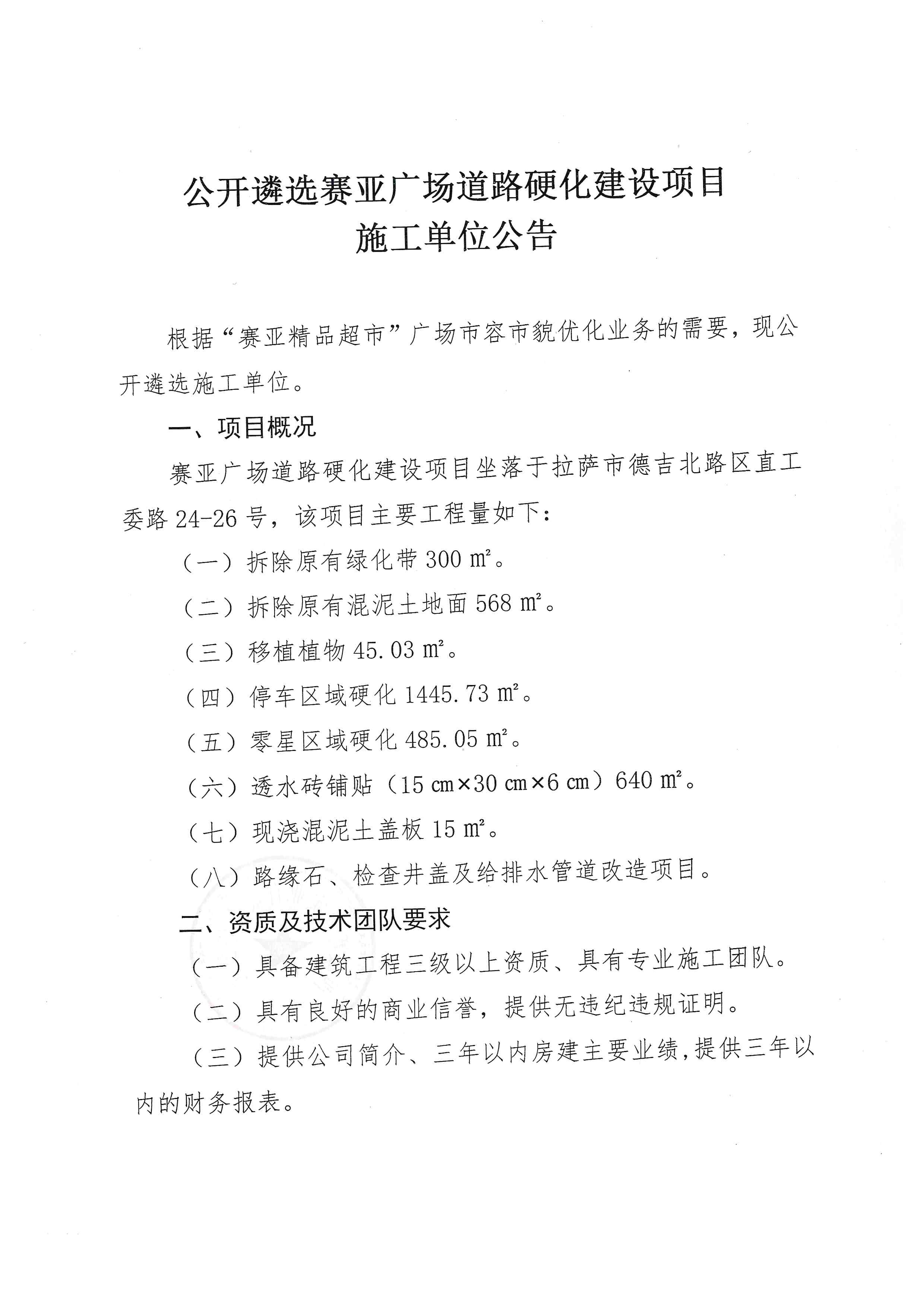 公開遴選公開遴選賽亞廣場道路硬化建設(shè)項(xiàng)目施工單位公告
