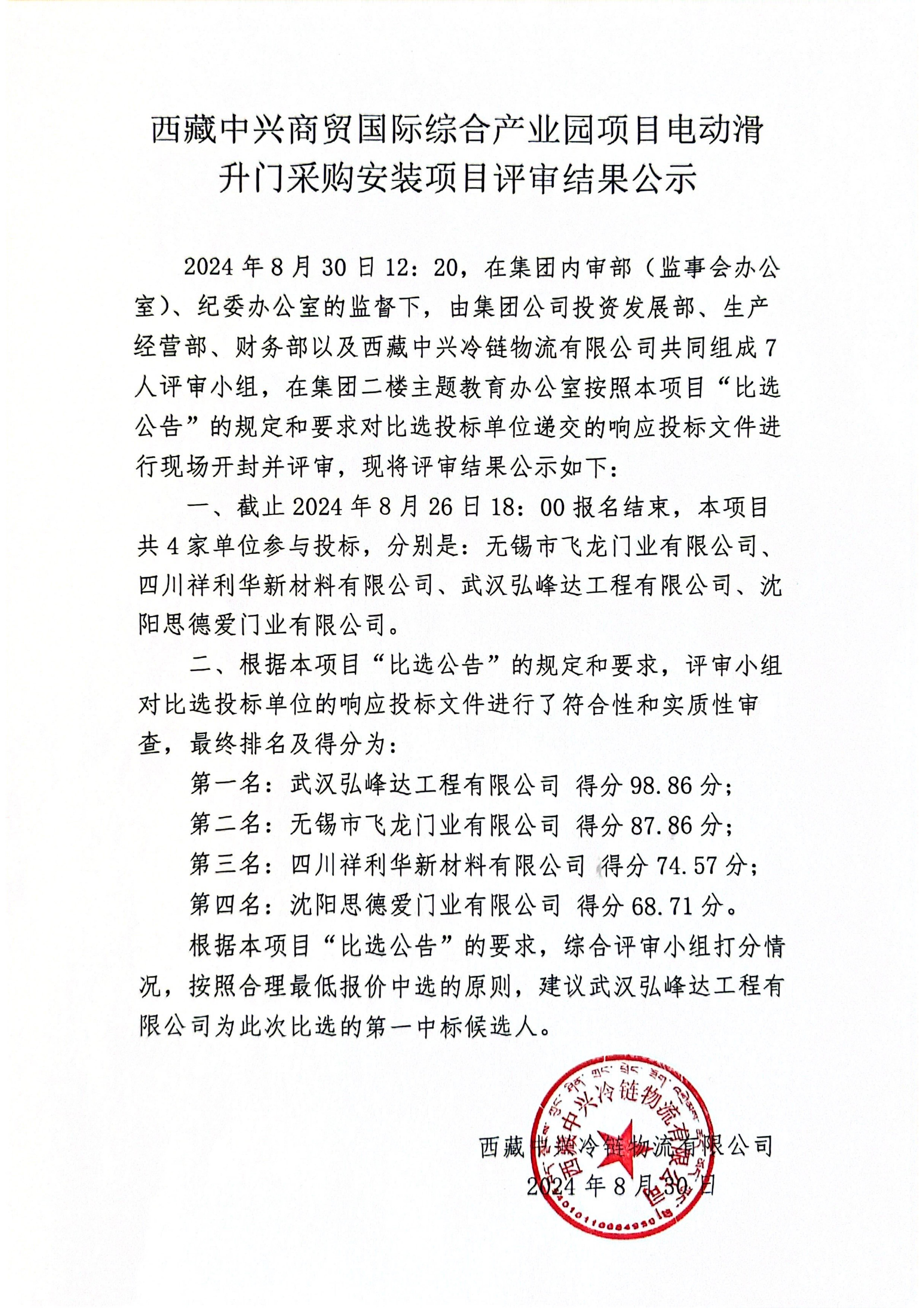 西藏中興商貿(mào)國際綜合產(chǎn)業(yè)園項目電動滑 升門采購安裝項目評審結(jié)果公示