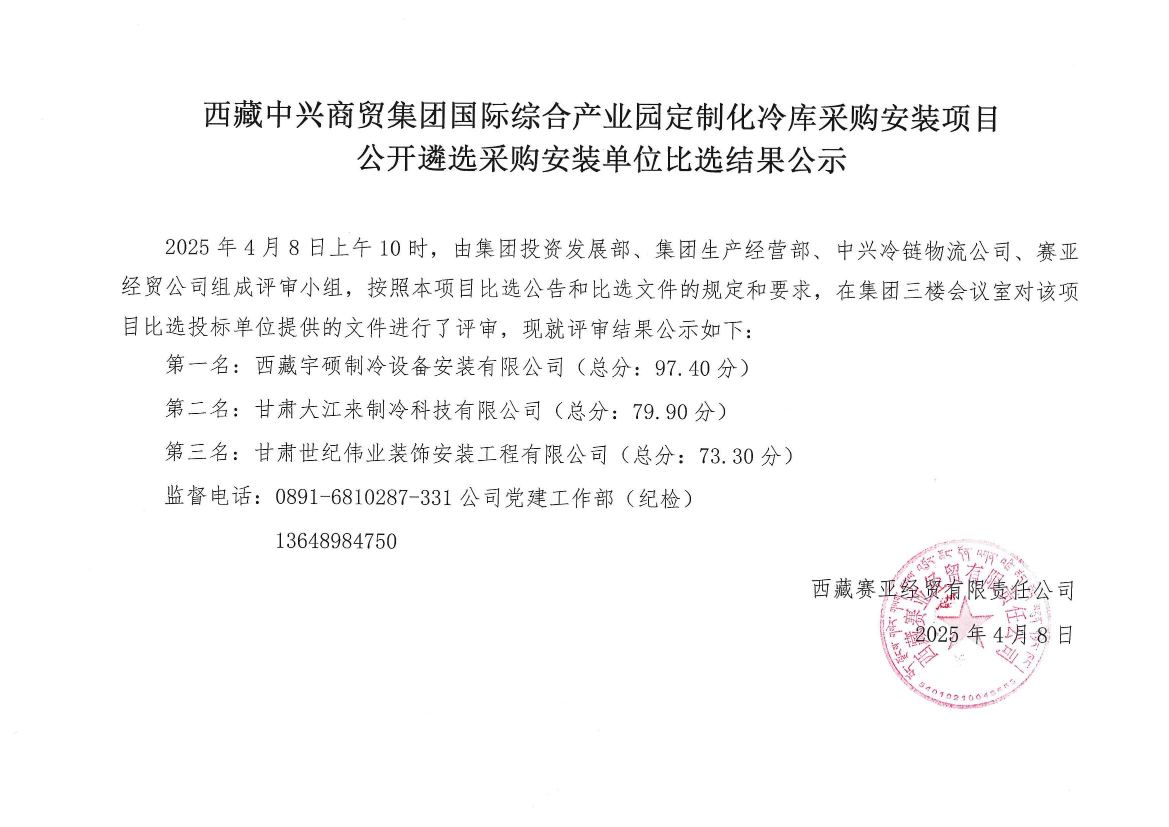 西藏中興商貿集團國際綜合產業(yè)園定制化冷庫采購安裝項目公開遴選采購安裝單位比選結果公示