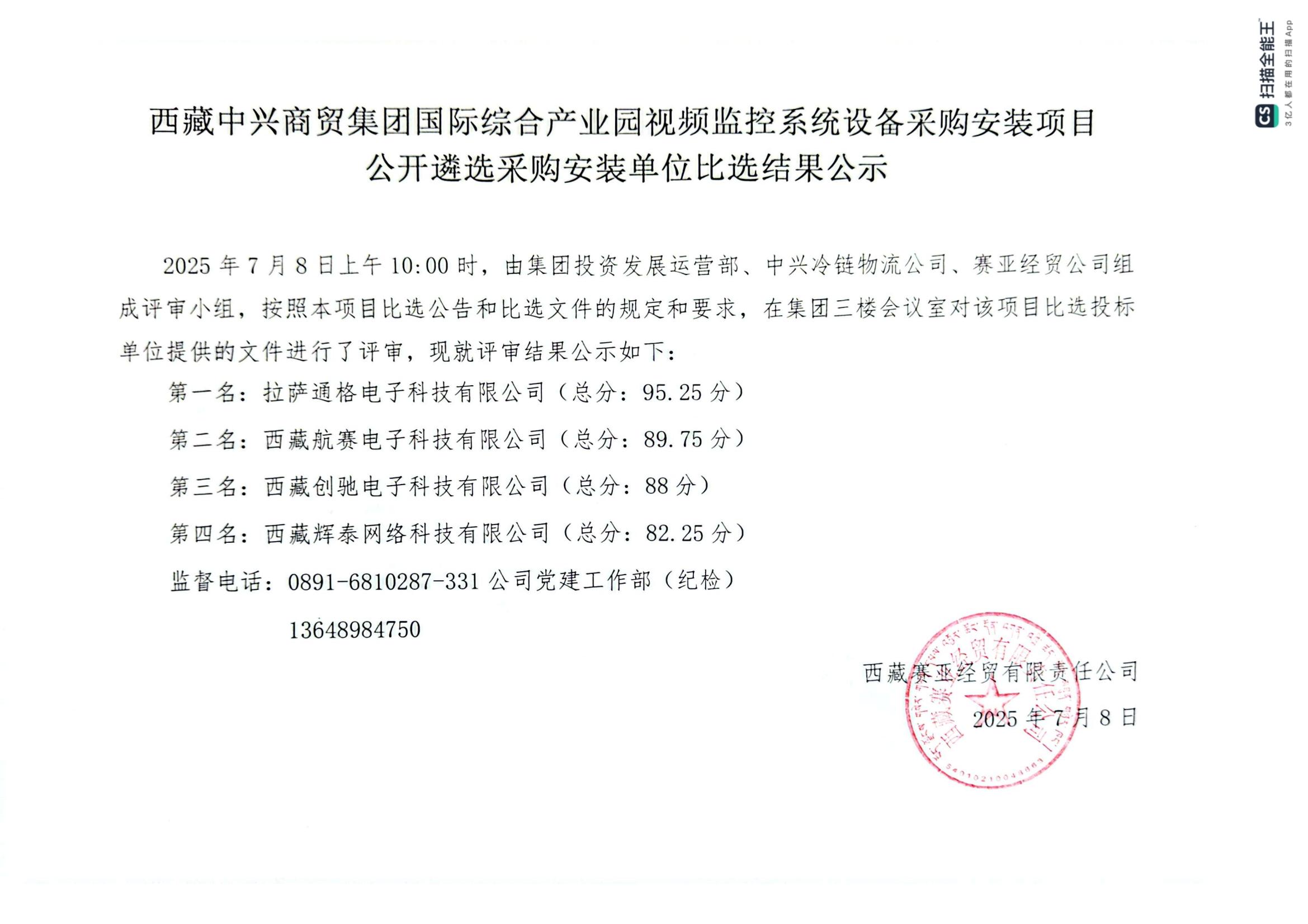 西藏中興商貿(mào)集團(tuán)國際綜合產(chǎn)業(yè)園視頻監(jiān)控系統(tǒng)設(shè)備采購安裝項目公開遴選采購安裝單位比選結(jié)果公示