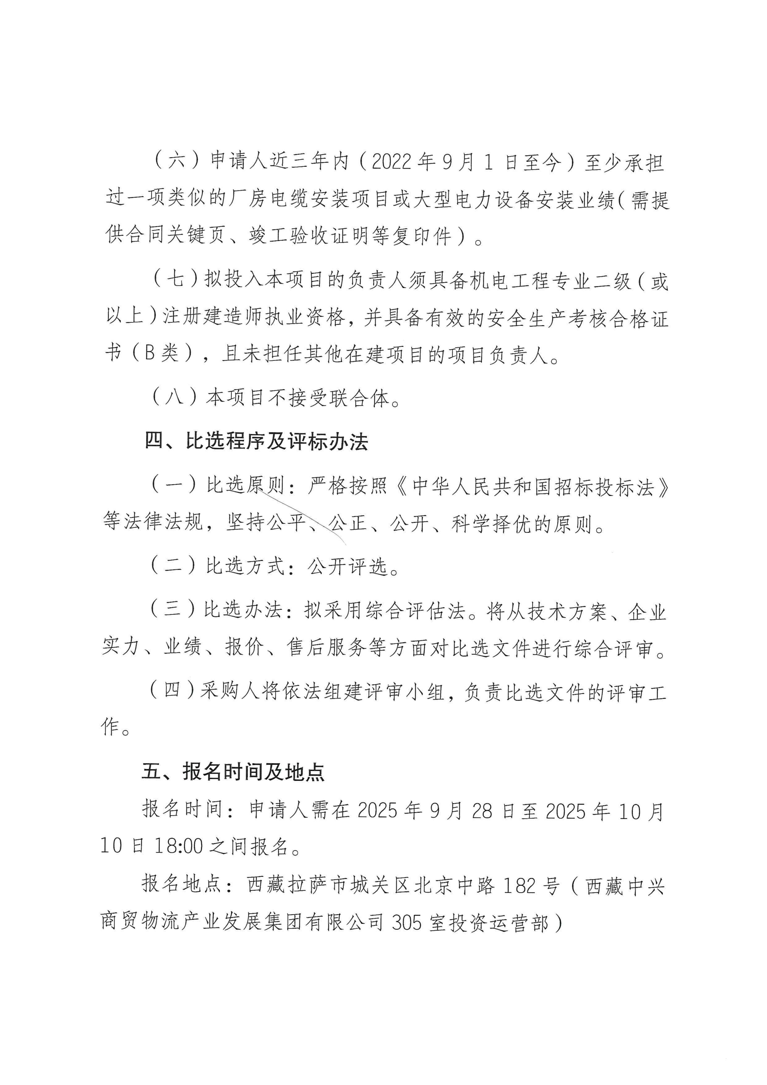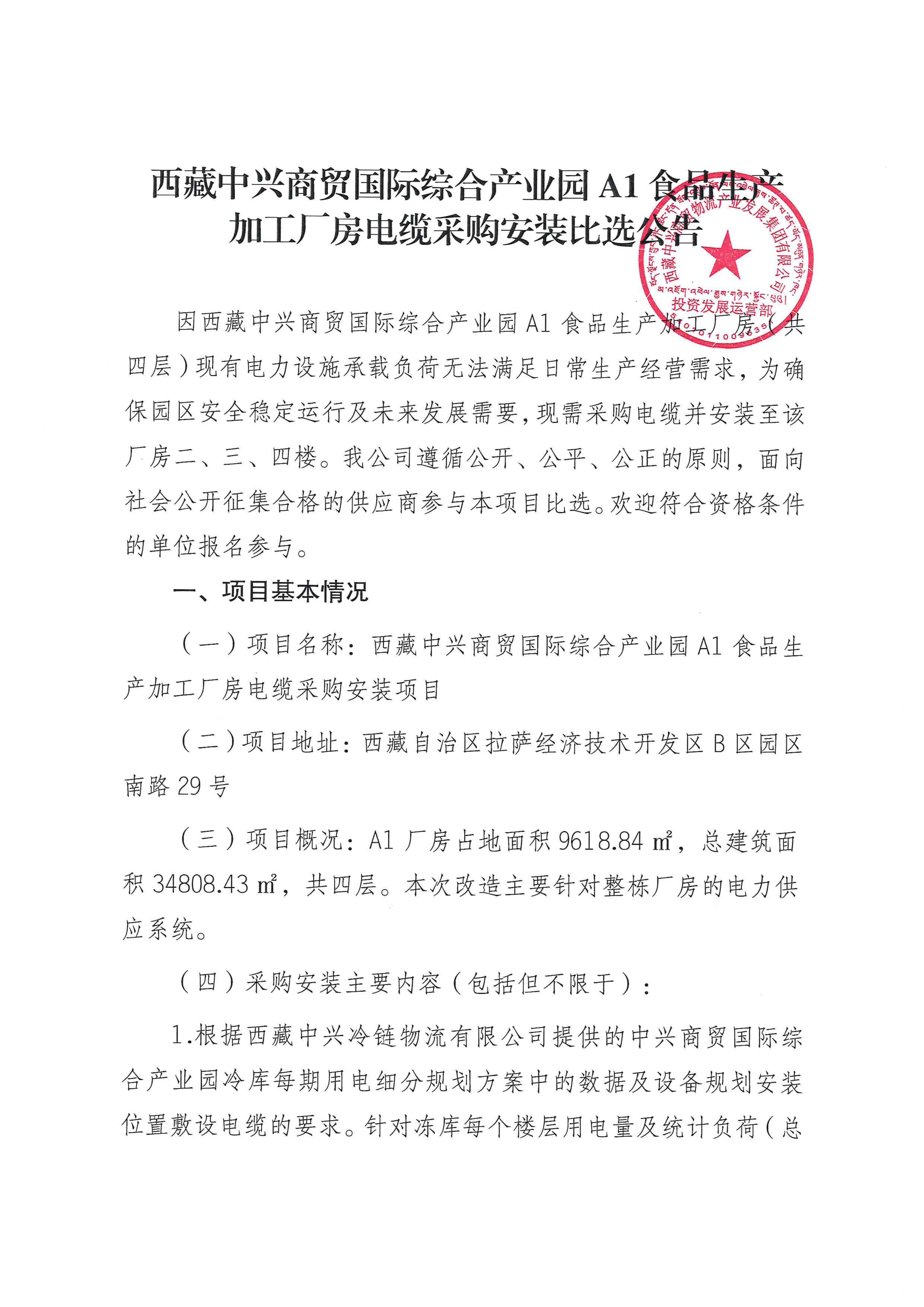 西藏中興商貿(mào)國(guó)際綜合產(chǎn)業(yè)園A1食品生產(chǎn)加工廠房電纜采購(gòu)安裝比選公告