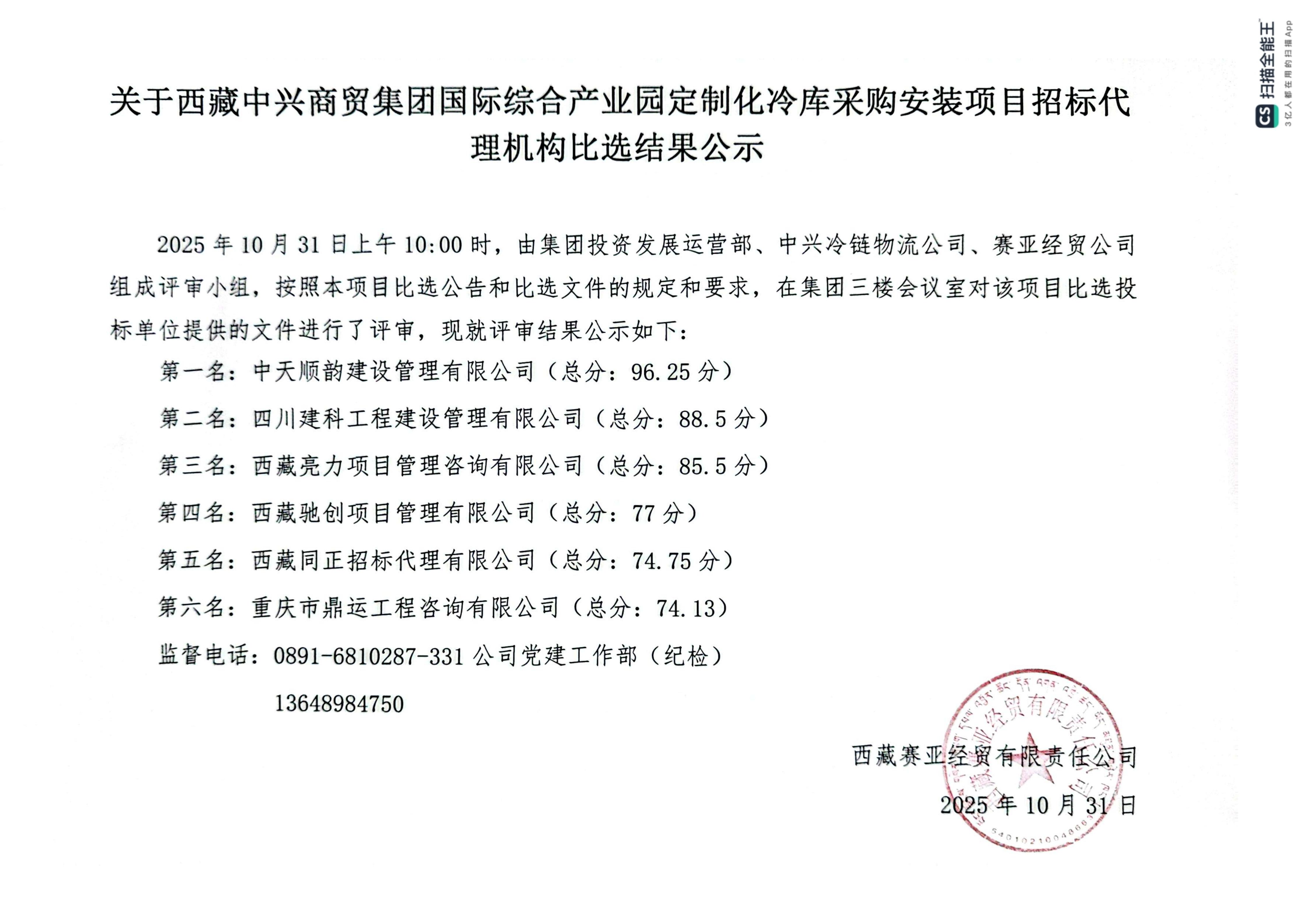 關(guān)于西藏中興商貿(mào)集團國際綜合產(chǎn)業(yè)園定制化冷庫采購安裝項目招標(biāo)代理機構(gòu)比選結(jié)果公示